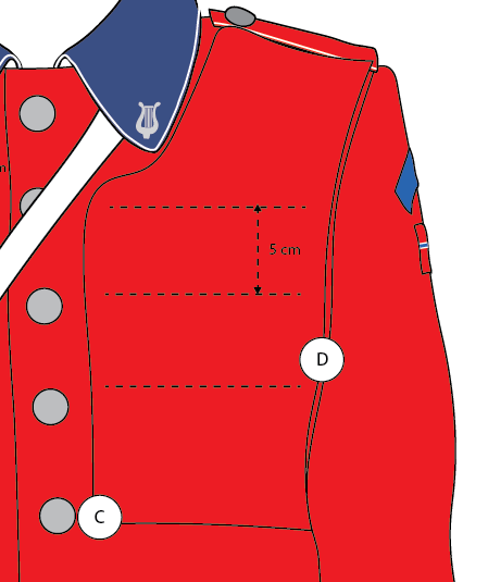 Monteres på høyre side. Snoren skal ligge under skulderklaff, og dusken festes ca. 2 cm under nederste stjernerad.