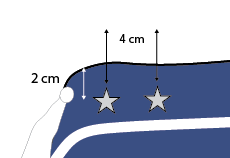 Den første stjernen monteres på venstre side på luen ca. 3 cm fra forkant og med senter 2 cm ned fra toppen, som vist nedenfor.