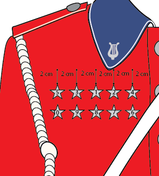 Monteres på høyre side. Snoren skal ligge under skulderklaff, og dusken festes ca. 2 cm under nederste stjernerad.