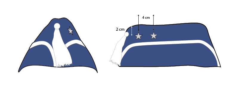 Den første stjernen monteres på venstre side på luen ca. 3 cm fra forkant og med senter 2 cm ned fra toppen, som vist nedenfor.